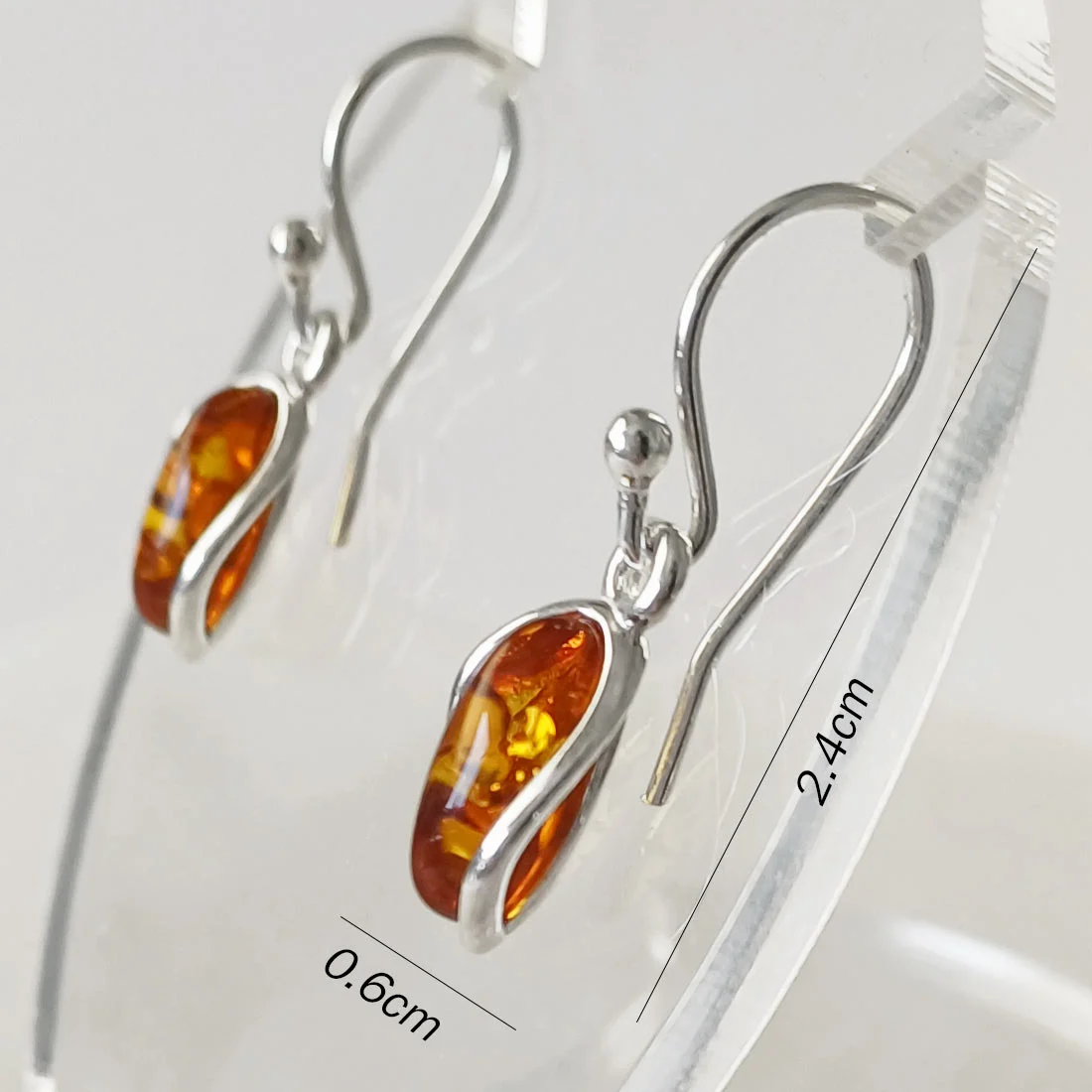 Amber is lightweight and warm to the touch, which makes it comfortable for earrings worn over long periods. Its color can range from honey-yellow and golden tones to deeper cognac shades. Because Amber is softer than most stones, with a Mohs hardness of around 2–2.5, it requires gentle handling. The smooth oval surface allows light to pass through the material, highlighting natural inclusions that formed during fossilization. The 925 sterling silver setting provides structural support and helps protect the Amber during normal use. When handled with care, Amber jewelry can maintain its surface quality and natural appearance over time.