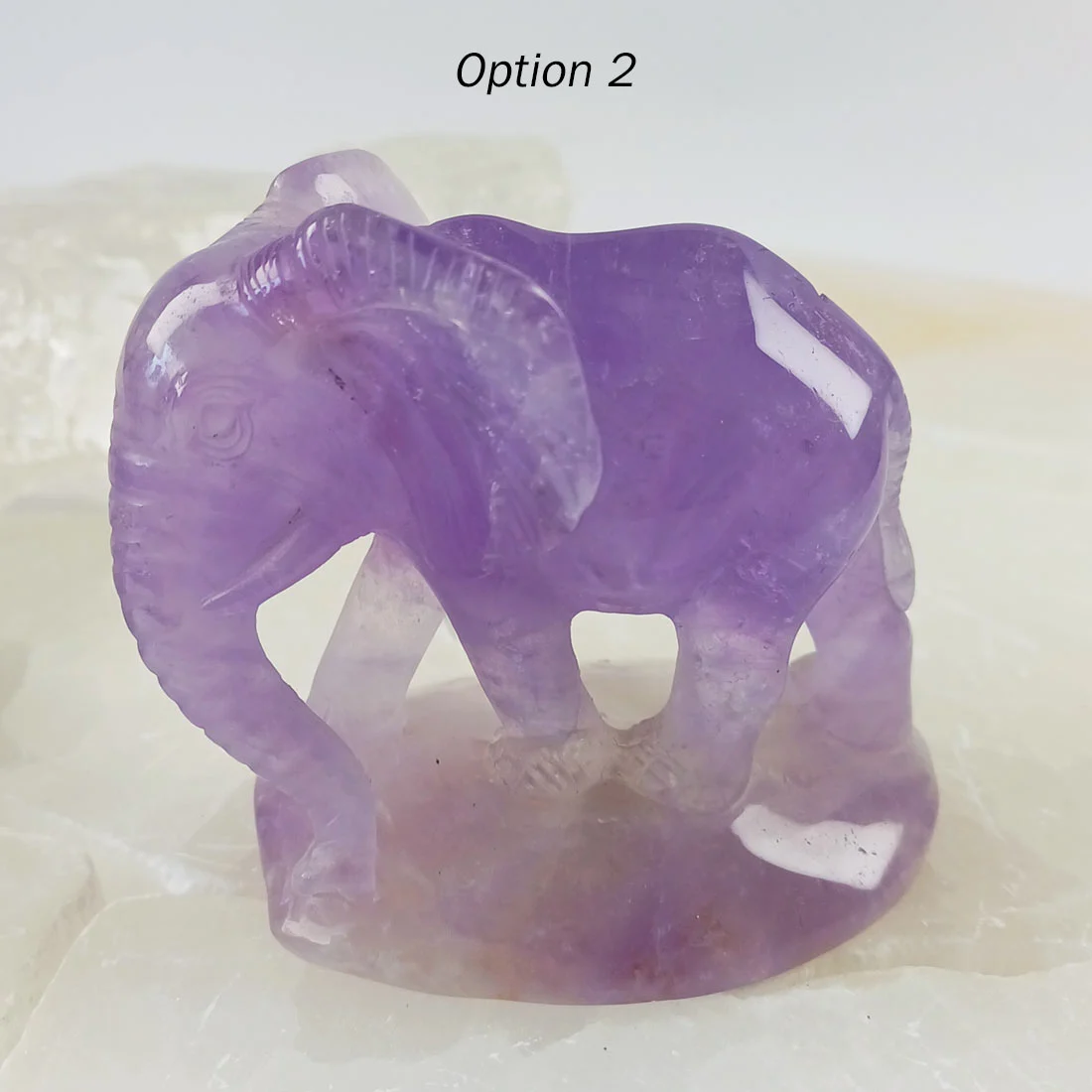 Amethyst Elephant Carving made from natural amethyst crystal. A carved stone figure suitable for display in personal spaces, meditation areas, or home décor.