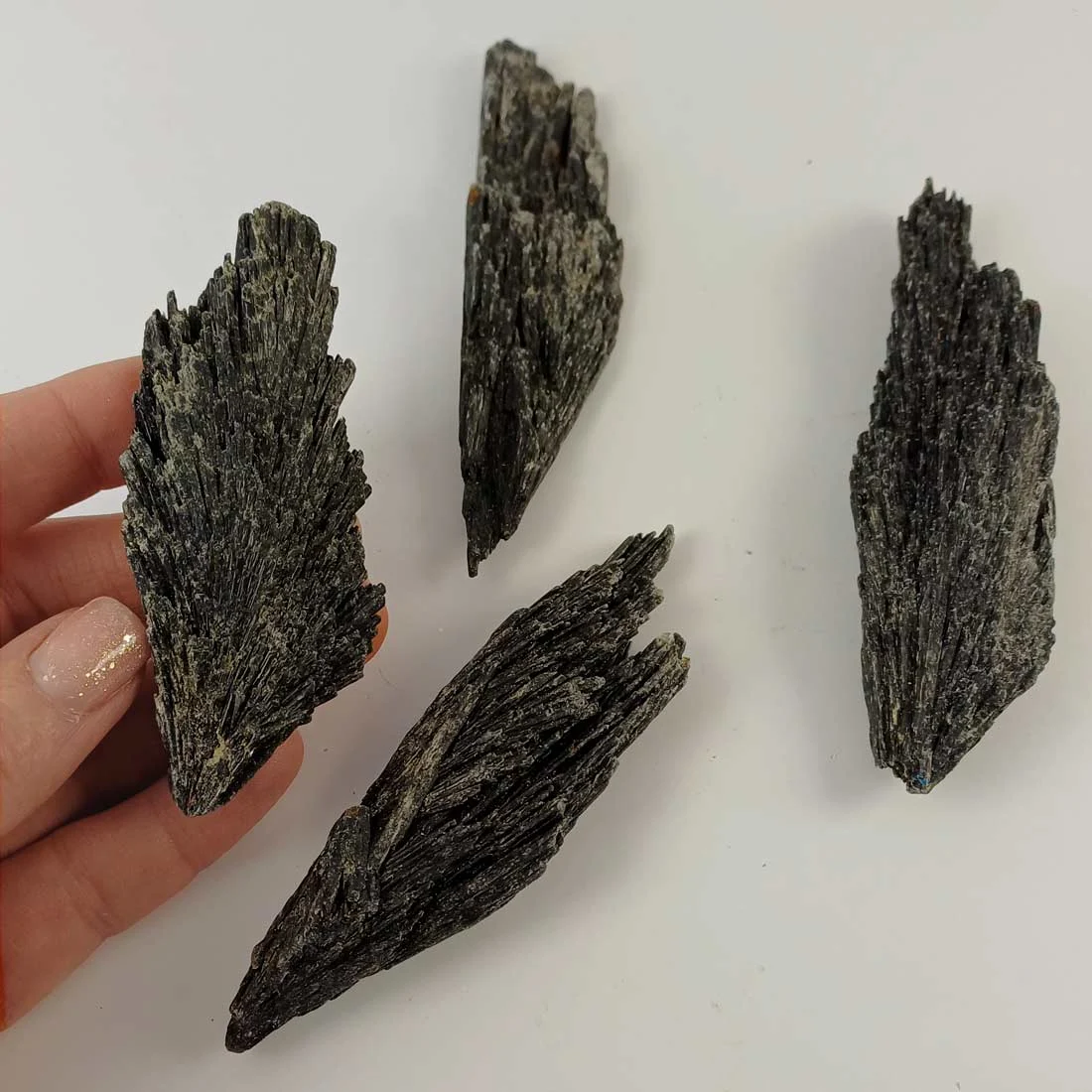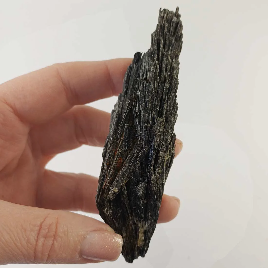 Black Kyanite is a member of the aluminosilicate family. It commonly forms long, fibrous blades that appear layered and slightly metallic. Although it has a textured appearance, it feels lightweight when held. The surface has natural ridges and fine striations that come from its growth pattern. Many people choose Black Kyanite because it does not require cleansing as frequently as softer minerals.