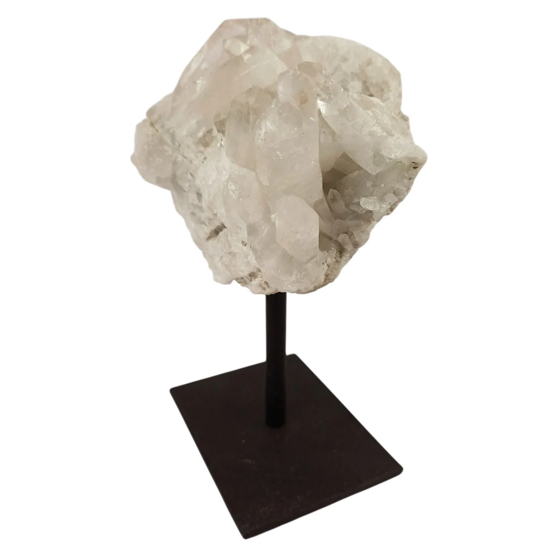 Clear Quartz Cluster on a metal stand. A versatile stone for energy work, décor, and meditation, known for clarity, amplification, and cleansing.