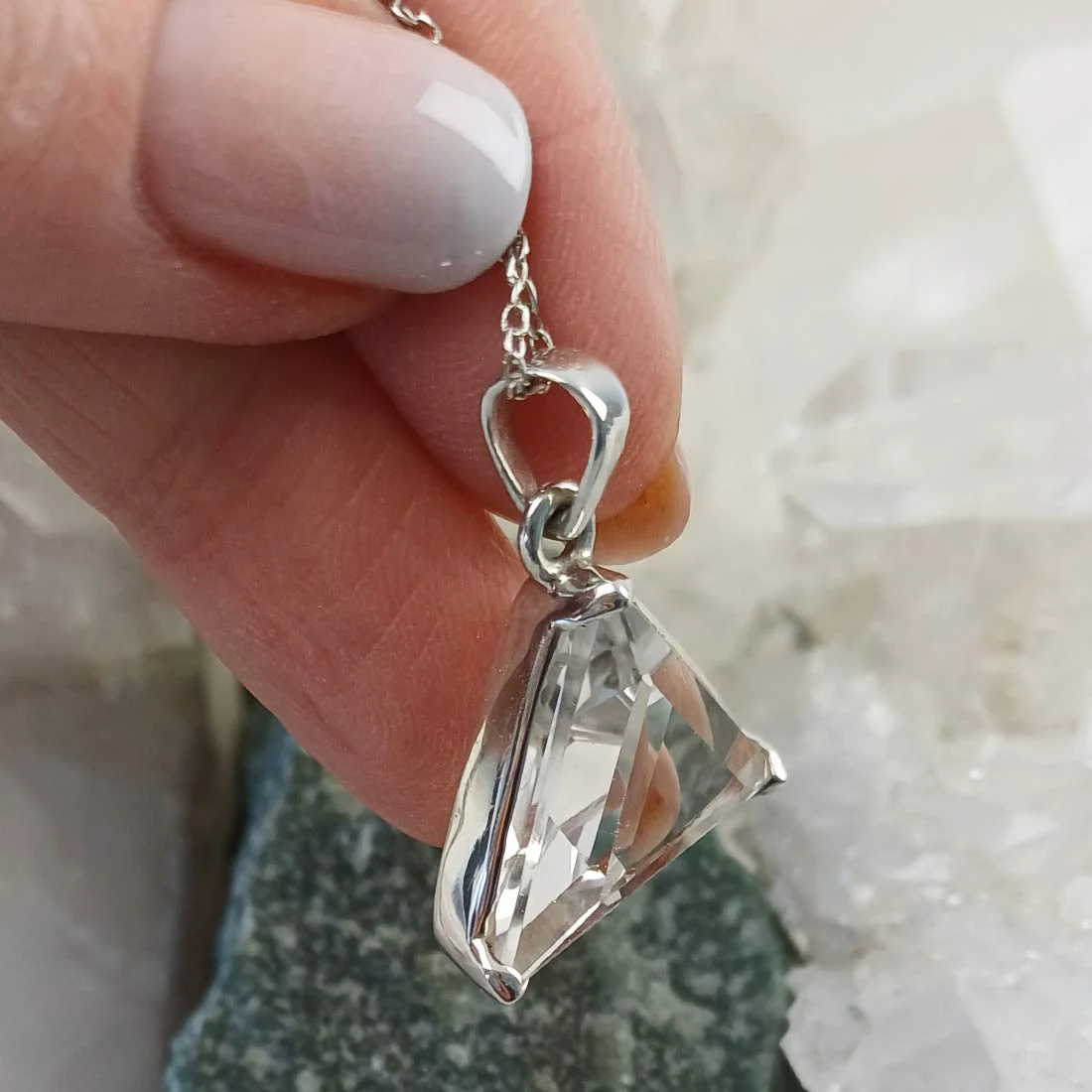 This pendant features a Clear Quartz crystal set in 925 sterling silver. The silver setting supports the stone securely while keeping the crystal visible from multiple angles. As a result, light moves freely through the Quartz, enhancing its natural clarity.