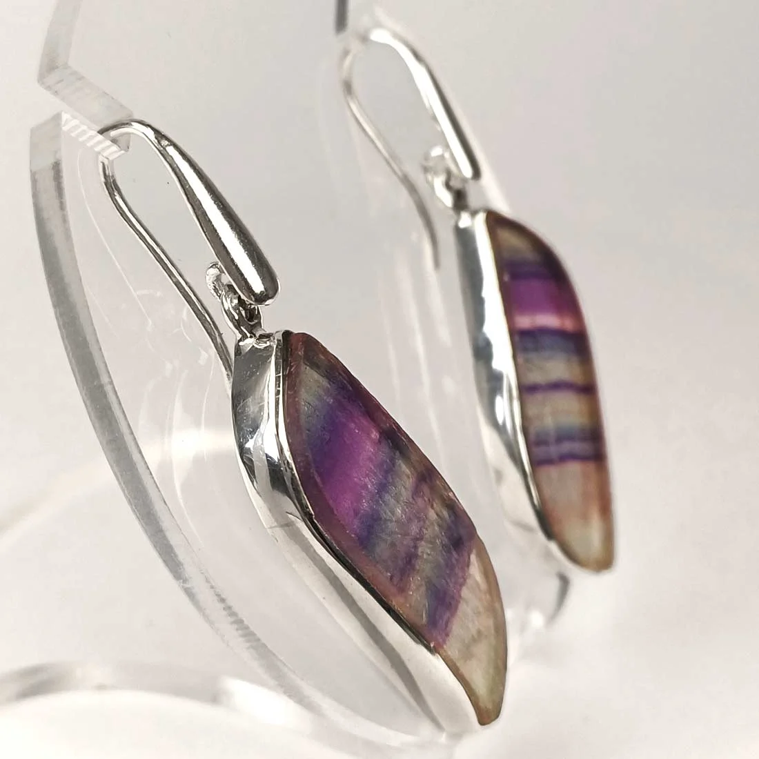 These butterfly wings earrings feature natural fluorite in sterling silver, blending soft green and purple tones with unique natural banding.