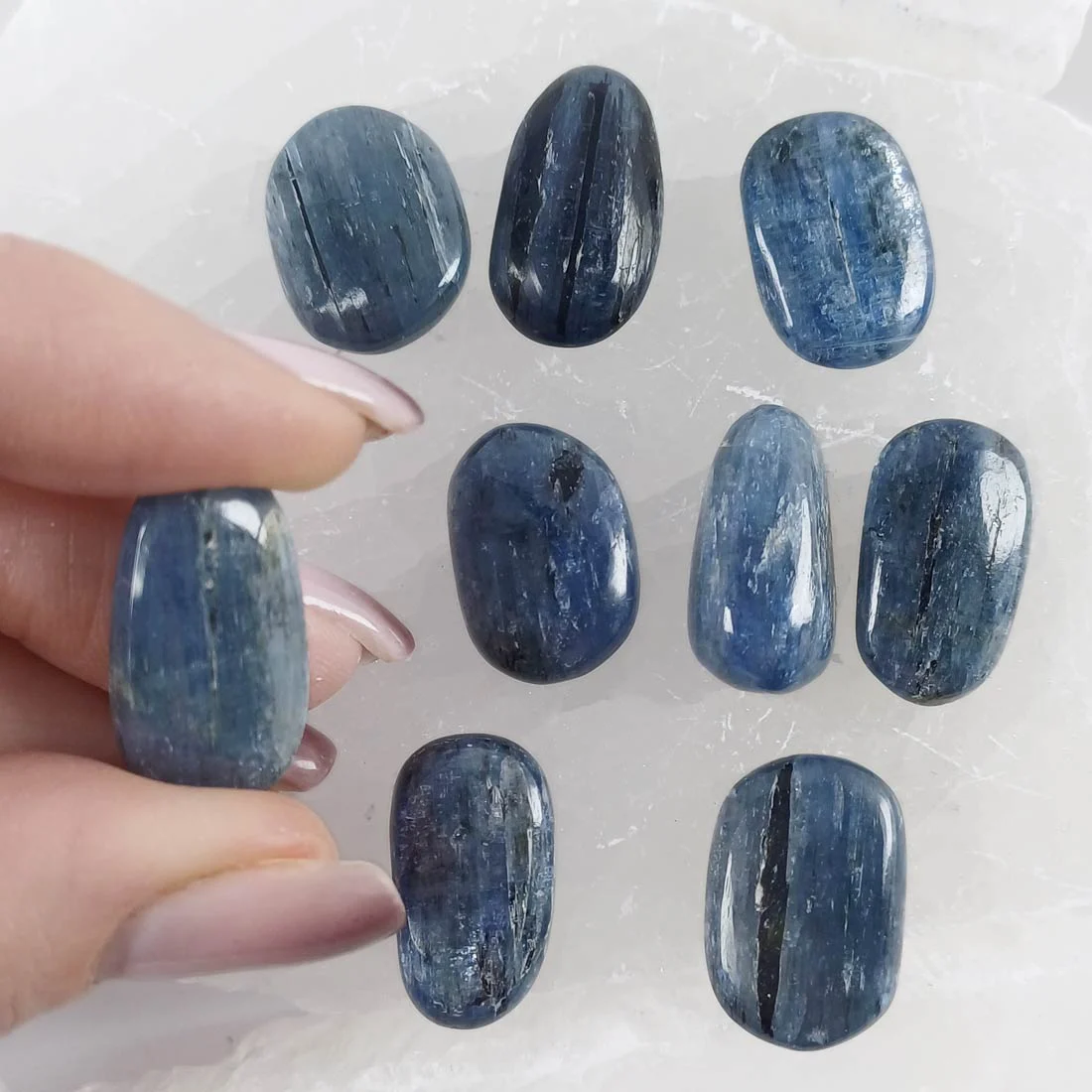 Tumbled pieces of Kyanite, a natural crystal known for its deep blue tones and connection to alignment and clear communication. Supports mental clarity, balanced energy, and honest self-expression.