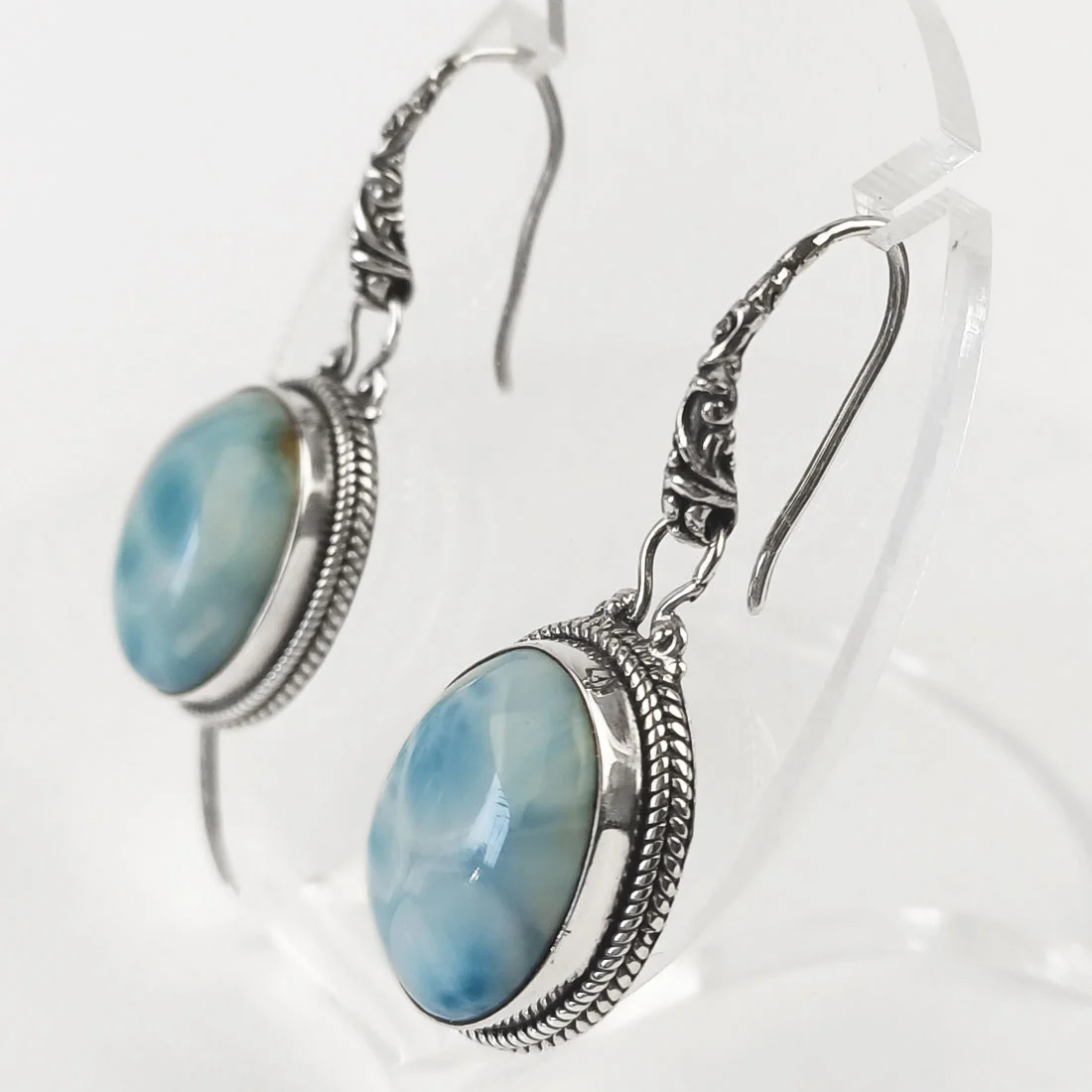 These natural larimar oval earrings feature calming blue and white marbling with ornate silver details. They support relaxation, emotional balance, and clear communication.