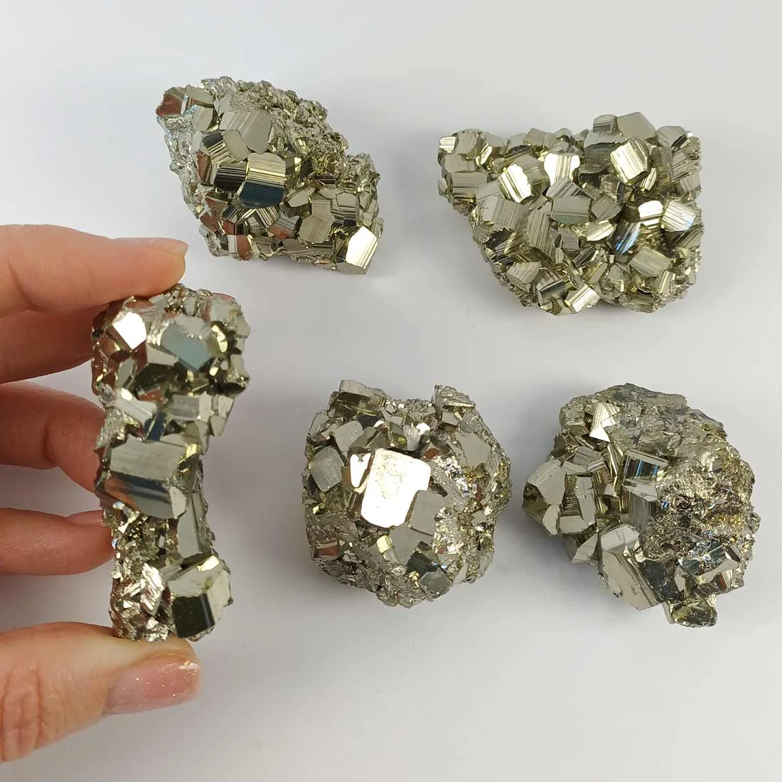 Pyrite features a natural golden tone and a metallic shine. The larger formations show strong cubic growth, and each cluster displays the mineral’s internal structure with clarity. Because pyrite has a firm hardness, it keeps its shape well and fits easily into shelves, desks, or personal collections. Additionally, the solid weight of the crystal gives it a grounded presence.