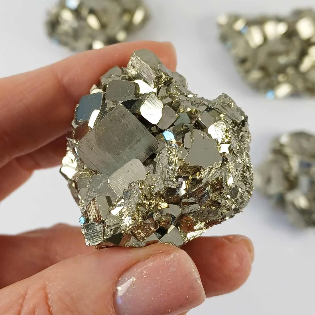 Pyrite is a crystal that forms in sharp geometric shapes and grows in dense clusters. These pieces show large crystal formations that create a textured surface with clear edges and natural depth. As you turn the piece, each side reveals new details, which adds interest without needing extra decoration.
