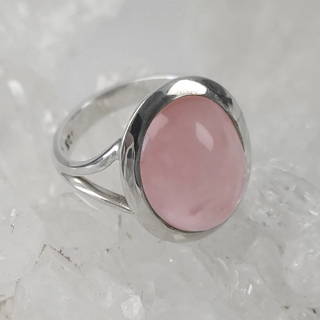 The sterling silver setting holds the crystal securely while still allowing light to pass through the oval shape. Its gentle pink tone pairs easily with both casual and formal outfits, making it suitable for daily wear. The lightweight design keeps it comfortable throughout the day, while the oval crystal sits smoothly against the skin. Because the ring balances simplicity with everyday function, you can move between different settings and activities without needing to take it off.