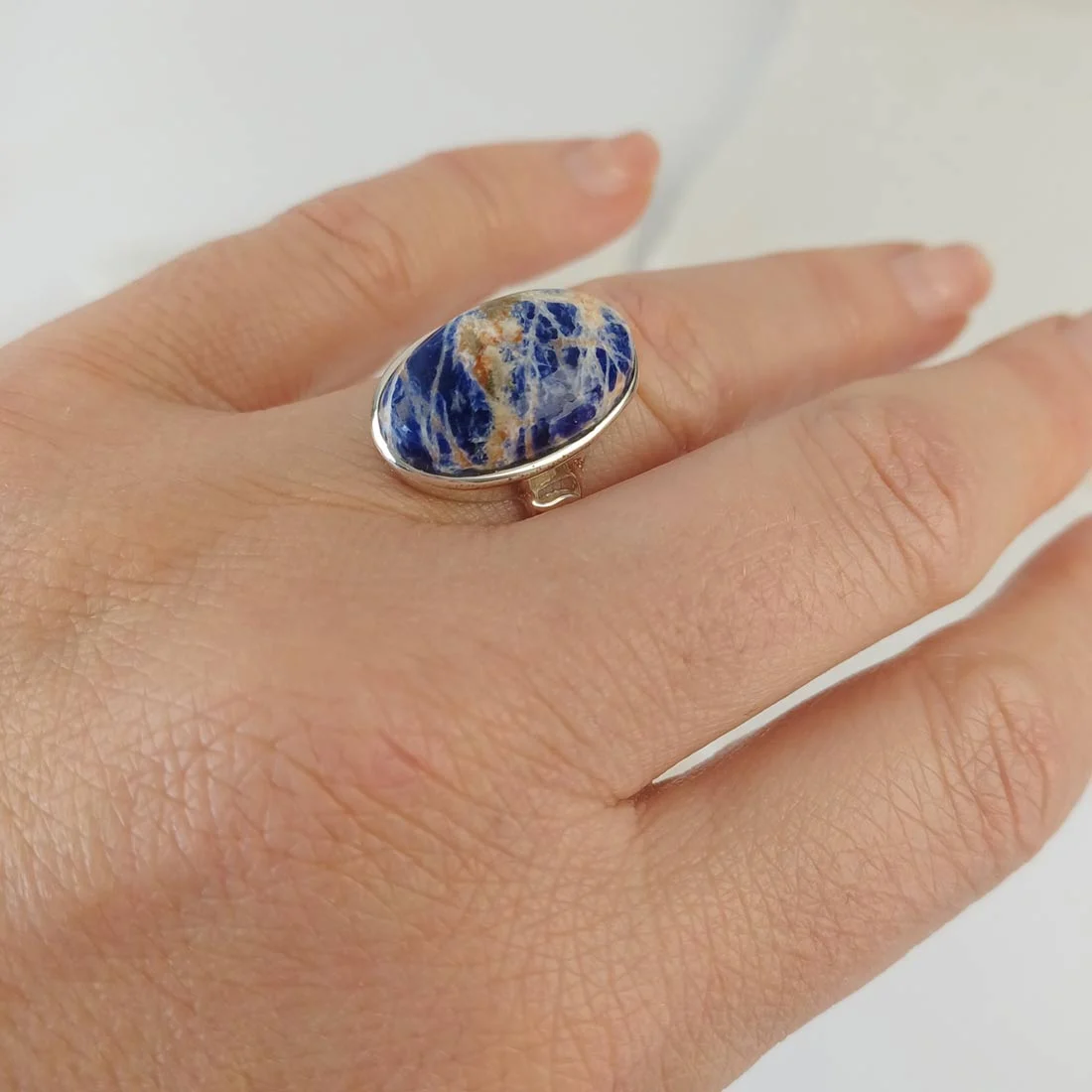 This Sodalite Oval Ring features a natural sodalite rock (πέτρωμα) set in 925 sterling silver. The smooth oval shape offers a simple and balanced look that fits comfortably on the hand. Because sodalite forms naturally, each piece displays variations in its blue-and-white pattern, giving every ring a unique appearance. These natural differences help highlight the individual character of each stone.